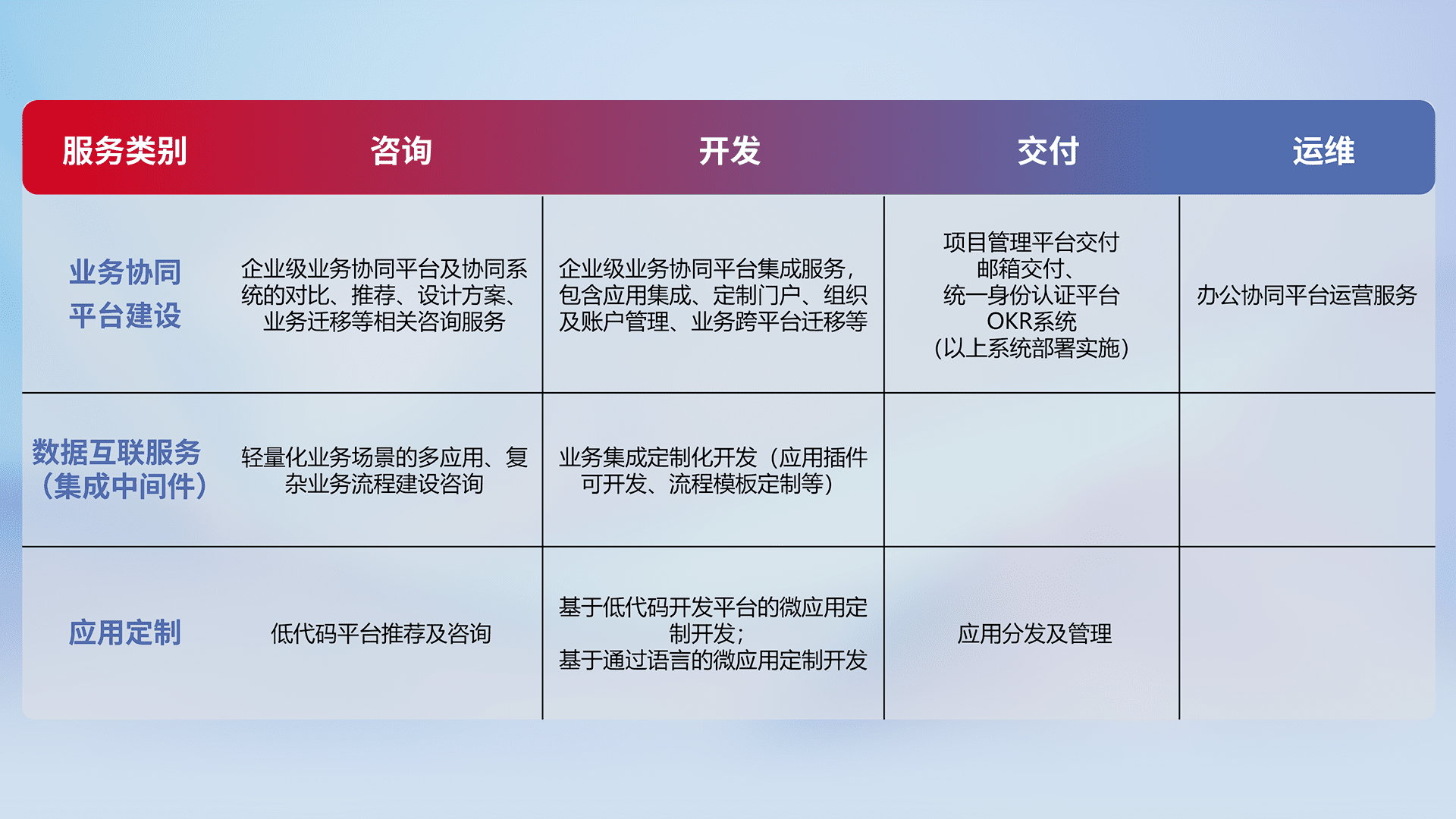针对钉钉、、、、企微、、IDaas等平台级产品提供产品的规划、、、方案、、、交付、、、定制化开发等服务,,,,实现如统一协同办公、、、、智能客户服务、、、混合会议管理、、、、智能数据查询、、、、等业务场景,,实现数字化转型。。